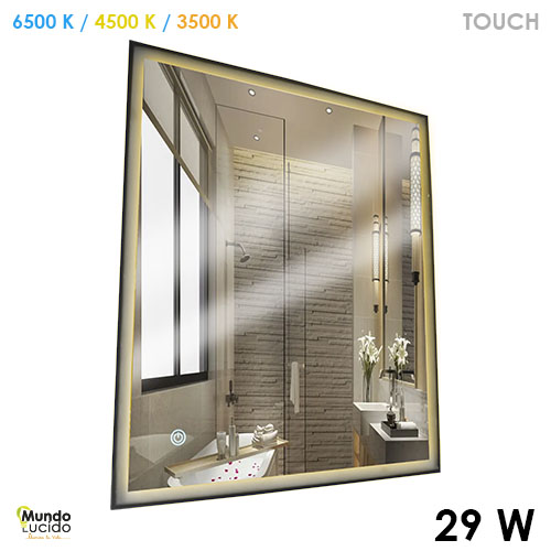 Espejo con diseño elegante, estructura de aluminio, sensor touch para encendido, apagado, cambio de color y para subir y bajar intensidad de luz